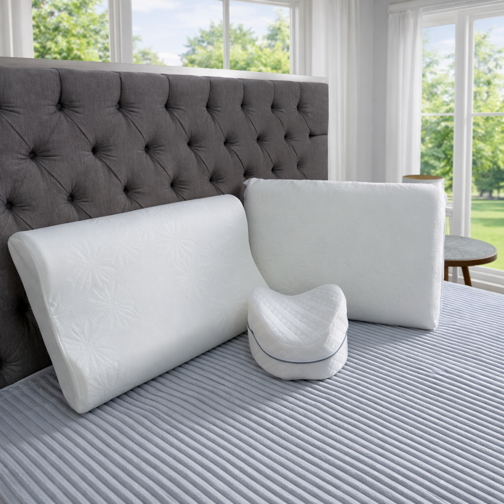 🔹 Cojín de Entrepierna Memory Foam Alinea tu columna mientras duermes de lado, reduciendo la presión en caderas, rodillas y espalda baja. Esencial para un descanso reparador.